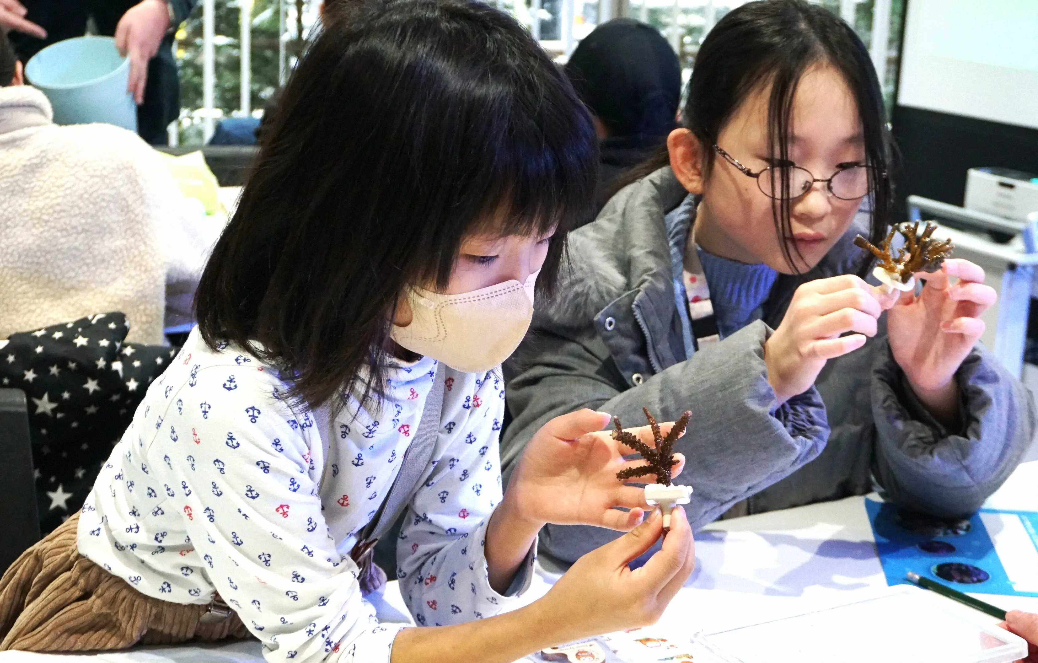 生きたサンゴを観察している様子護者総勢44名が参加しました。クイズを交えた参加型のインタラクティブ学習では、サンゴの神秘的な生態とともに、地球温暖化による海水温上昇等の環境問題についても学び、子供たちからも積極的な発言が飛び交いました。続く水槽展示観察では、水槽に顔を近づけて夢中で観察している様子も見られました。実際に目で見て、触れる体験を通じ、サンゴの未来を守るために自分たちができることを真剣に模索する時間となりました。